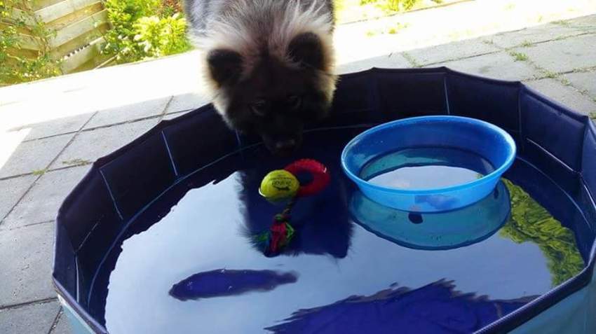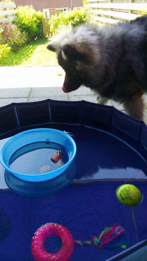 Vandaag is t warm. Paddy heeft kennisgemaakt met het zwembadje. Er in gaat ie nog niet, maar hij is toch een beetje nat geworden!