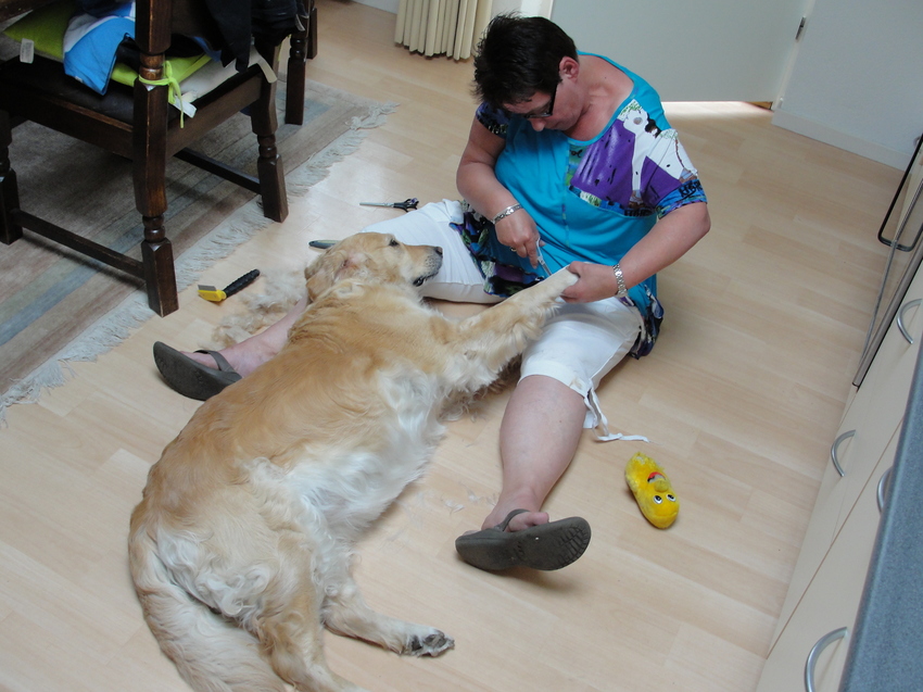 Echter wanneer de staart en achterhand aan de beurt zijn moet mijn vrouw even de halsband vasthouden want daar heb ik toch twee handen voor nodig om het zo zacht mogelijk te doen.