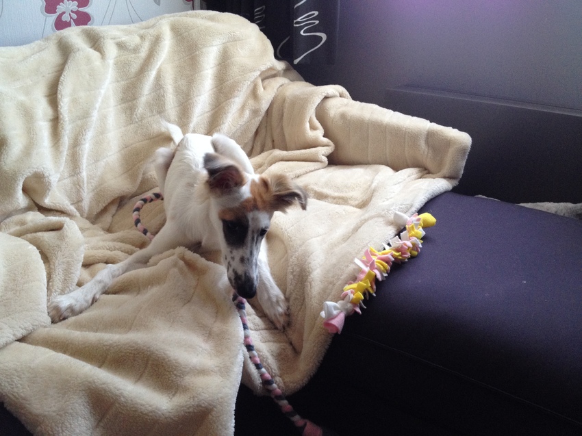 En op dit moment ligt mevrouw heerlijk content met haar nieuwe fleece speeltjes te spelen op de bank