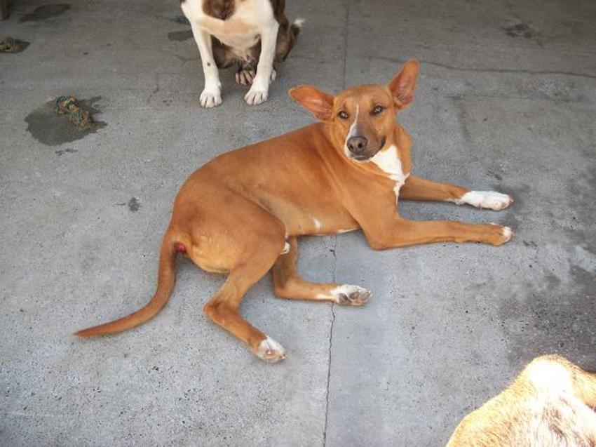 nee hij heeft in Spanje Rectum prolaps gehad, en later hier een poliep die een soort aambei was, zo moet je het maar zien, afspraak voor de dierenarts stond en toen heeft Faro hem afgescheurd aan een bosje, bramenstruik misschien, het was heel lastig te hechten, maar wel gelukt, er was een vierkant huis weg, en de poliep ook.