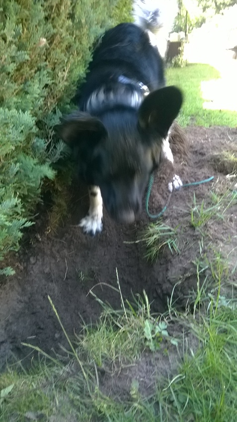hij is heel fanatiek met een gat graven.. wel altijd op dezelfde plek. Hij graaft en graaft, eind vd dag gooien we het weer dicht en de volgende dag begint hij weer opnieuw, haha