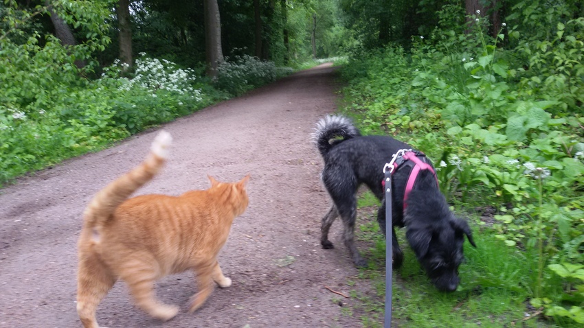 Ook omdat als we een andere hond tegen kwamen, die op de kat wou jagen.