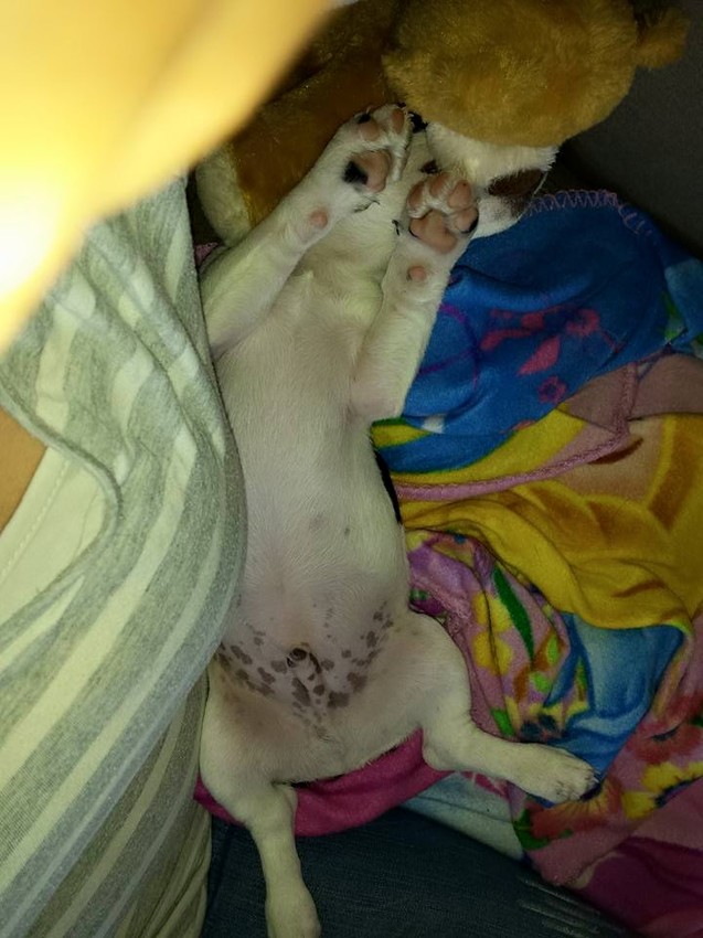 Ja hij ligt heerlijk te slapen, hij slaapt graag op zijn rug heb ik al gemerkt. Op de bank ligt hij ook vaak op zijn rug tegen mij aan.