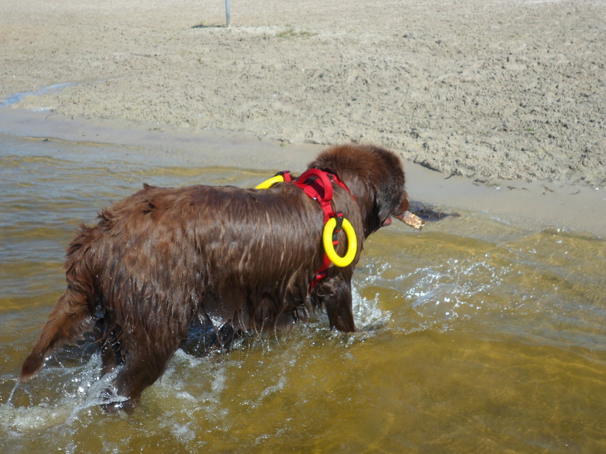 Ik heb op dit moment zo'n noors tuigje, waar ook een handvat aan zit. Je kan haar daarmee ook uit het water trekken, maar het lijkt me wat comfortabeler als een tuig niet alleen aan haar borst trekt, maar ook aan haar buik.