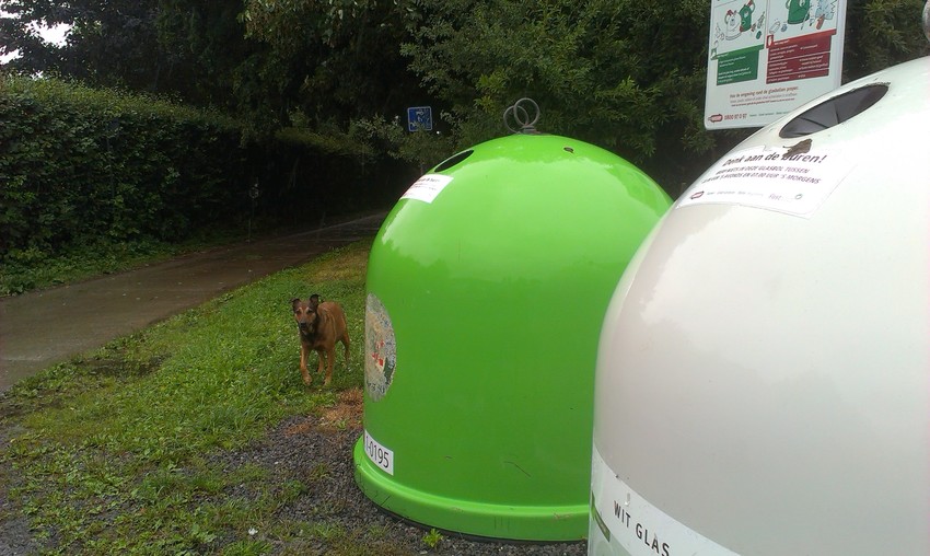 En aan de glascontainers vertrekt een heerlijke wandelweg... "Loop al maar" riep ik terwijl ik de flessen in de containers gooide... Kylie liep en toen hoorde ik... "Hier! Hier komen !"