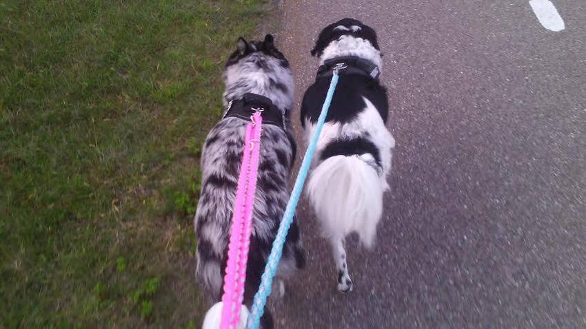 1 a 2 keer per week loop ik met de honden naar het losloop parkje. Dat is zo'n 25 minuten voetpad en daarna volgt er een grindpaadje die ik in zo'n 10 minuten afleg. Daar kunnen ze eindelijk los lopen