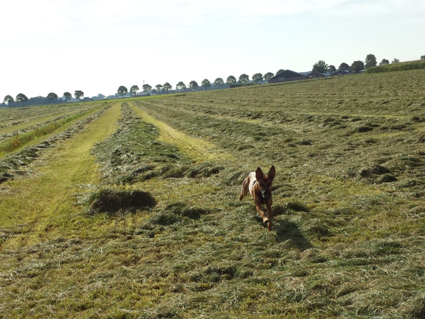 Hier tegenover helaas een boer die t niet goed vind. Maar gelukkig hebben we in onze wijk veel gras en dus ook een hoop plezier. Puck vind het vooral leuk om door het gemaaide gras te rollen. Ruikt natuurlijk lekker en ze komt dan helemaal groen van de sprieten weer naar me toe!