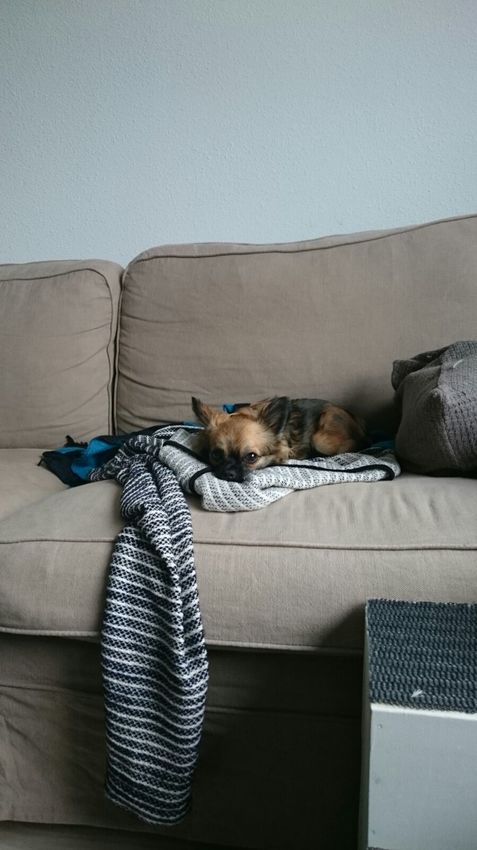 Als ik me nog kleiner maak misschien ziet ze me dan niet op de bank op het vest van het vrouwtje liggen.