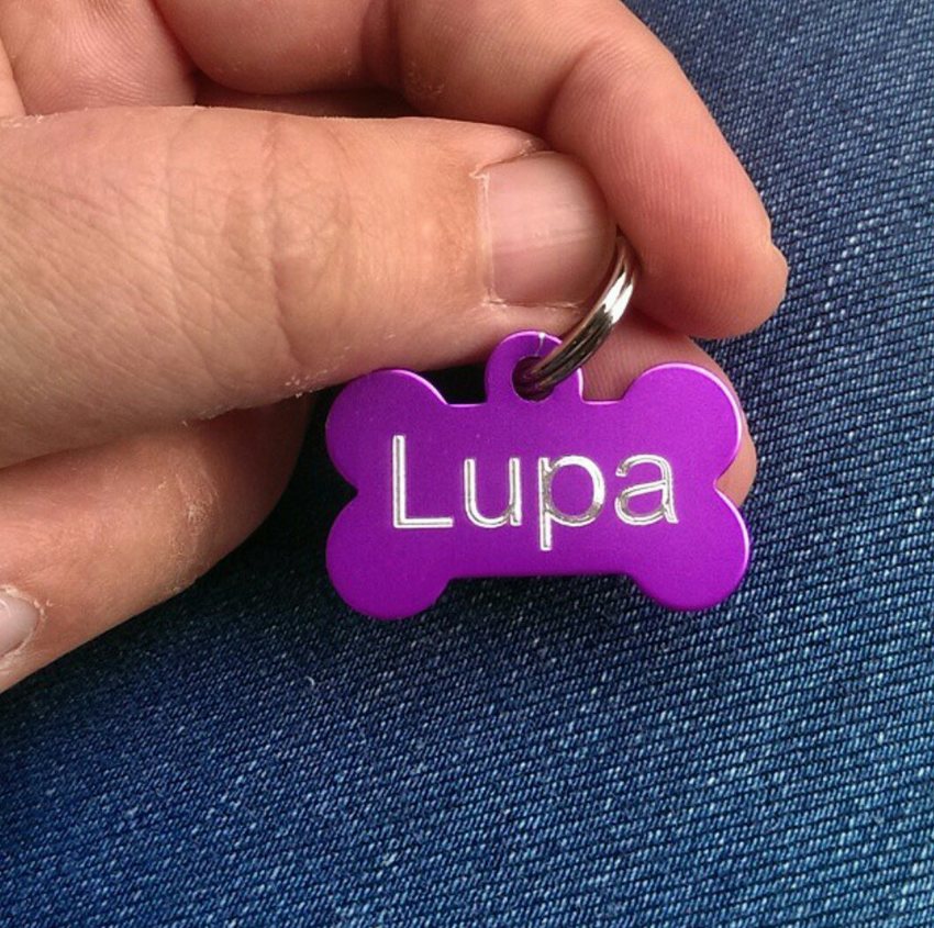Later heb ik een hele simpele gekocht bij Penning Voor Je Hond, een paarse cirkel. Op de randjes slijt de kleur een heel klein beetje (maar ze heeft 'm elke dag om haar nek tijdens de lange wandeling). De gegraveerde tekst is nog steeds goed leesbaar.