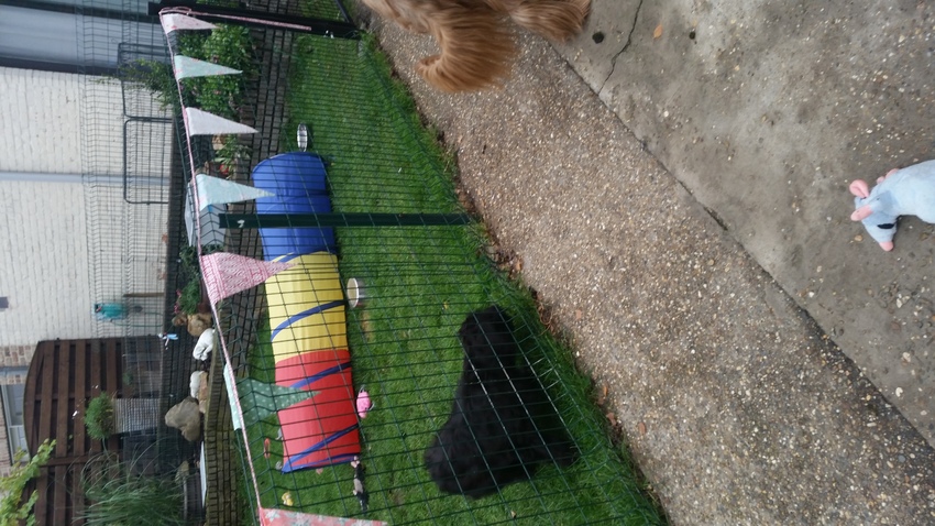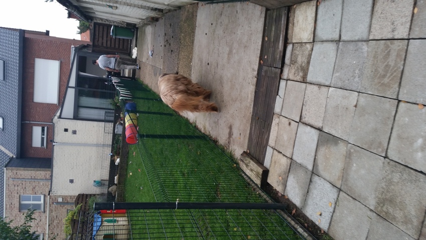 ons gras is afgespannen met draadpanelen van een meter hoog achteraan 1.50. zodat Ely veilig buiten kan en de andere langs de draad loskunnen en haar kunnen zien.