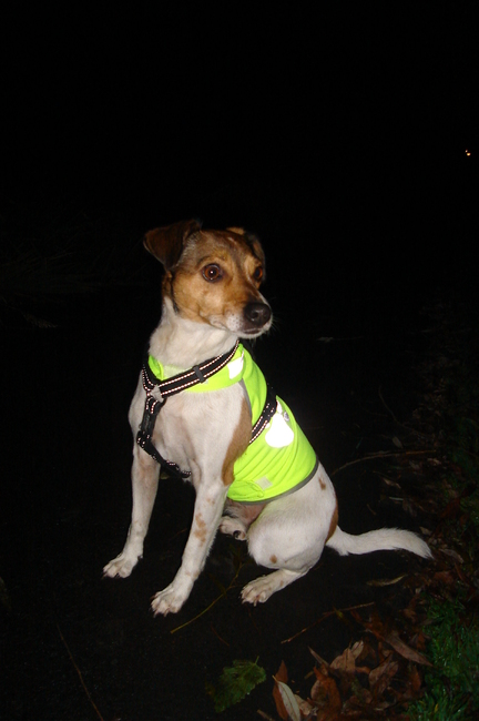 Zo'n refelcterend vestje zoals YmY aangeeft is dan ook handig om aan te doen want op het moment dat er dan licht op schijnt bv van een voorbij of tegemoet komende auto valt ze extra goed op (vestje sluiten vaak ook goed aan waardoor de hond er ook geen last van heeft). Op mijn profiel heb ik een foto van Loekie staan volgens mij dat ze zo'n vestje aanheeft.