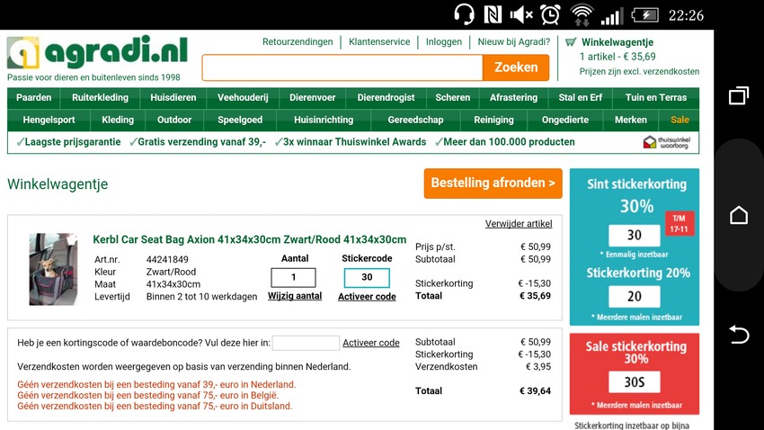 Rechts in de balk staan de stickercodes, die kan je in het vakje achter het product (onder in de winkelmand is voor waardebonnen) invullen. Nu is de code 30 en 20 geldig.