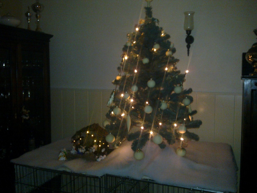 ik heb er bij beide helemaal niet over nagedacht, gewoon de boom neergezet, ze hebben er totaal niet aan gezeten, ik had er zo'n sneeuwdeken onder liggen en daar gingen ze op liggen, onder de kerstboom, heel schattig gezicht.