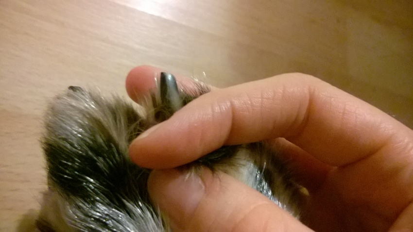 Ik heb bij Gijs toch van de voorpoot de twee middelste geknipt, waren niet zo heel lang, maar zo is het wel beter denk ik. Bij de zwarte heb ik dezelfde hoeveelheid afgeknipt als van de witte. Gijs heeft zelfs een nagel die is half wit en half zwart