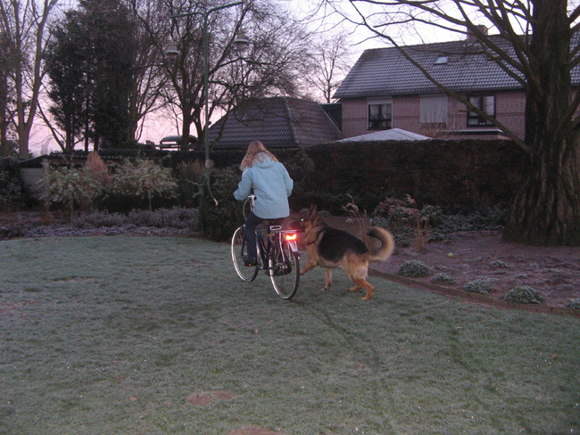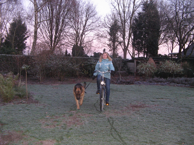 Mexx loopt mee aan de fiets sinds hij 9 maand is. Dus nu ruim 6 jaar..