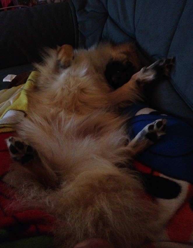 Lila, te moe om helemaal op de zetel te kruipen, viel halfweg in slaap.