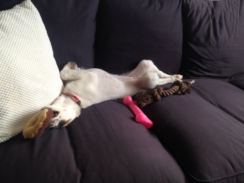 hier viel ze zelfs in slaap tijdens het spelen als pup met haar speeltje nog vast