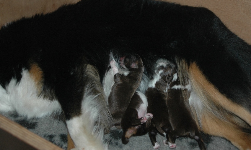 Op 20 december, 3 dagen na de bevalling van haar pups is onze lieve Luna na een spoedoperatie overleden. Bij thuiskomst hebben we Venda (die tegelijk met Luna loops was) bij de pups gelaten. Ze begon de pups gelijk te verzorgen en liet het toe dat de pups bij haar gingen zuigen. Een bijzonder onroerend moment toen ik besefte dat ze spontaan was begonnen met melk geven. Natuurlijk had ze niet genoeg melk voor de pups en hebben we ze naast de melk van Venda ook de fles gegeven.