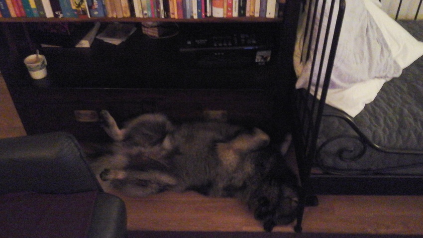 Zora ligt zo ook vaak. Vooral s avonds. Ze eet zelfs haar kluifjes in die houding, haha. Z ligt zo ook weleens gewoon in d'r eentje door de keuken te rollen. Ik zie het als een teken van ontspanning. Dat ze zich op haar gemak voelt.