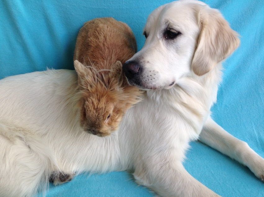 Met konijnen gaat dat net zo, je hondje accepteert de konijnen in huis.