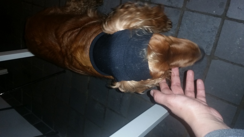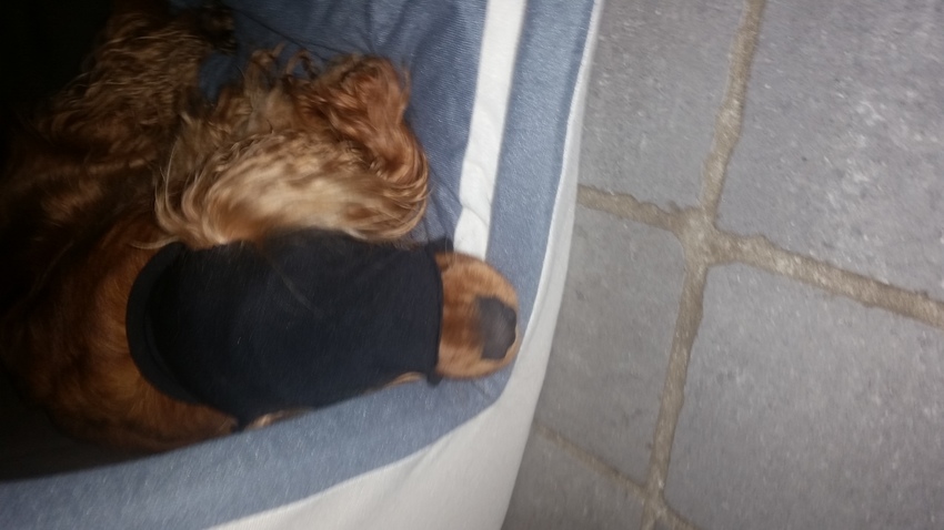 Ik heb wat gemaakt.. Hij vind niet fijn bij zijn oren. Als we naar buiten gaan of naar bed krijgt hij het toch om. Moet hem nog een beetje aanpassen. Zou dit voldoen als ik er 2 maak? Over elkaar heen b.v. Hij trekt zelf ddat ding over zijn ogen en gaat dan rustig liggen, net of die dat fijn vind gekke hond