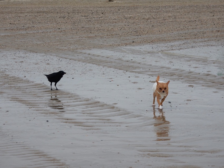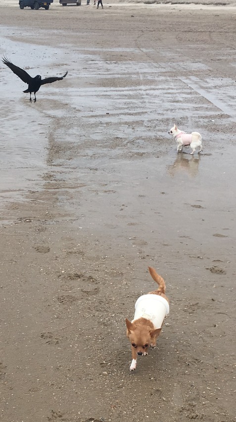 Die kraai is echt groot zo bij jouw hondjes, helemaal als die z'n vleugels uitslaat.