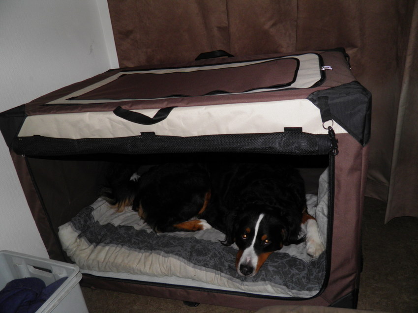 Edit: staat altijd open. Puur bedoeld als veilige hut en zo ervaart ze het ook. Een gewone bench zette ze toen ze klein was geen poot in. Echter de fietskar lag ze graag in