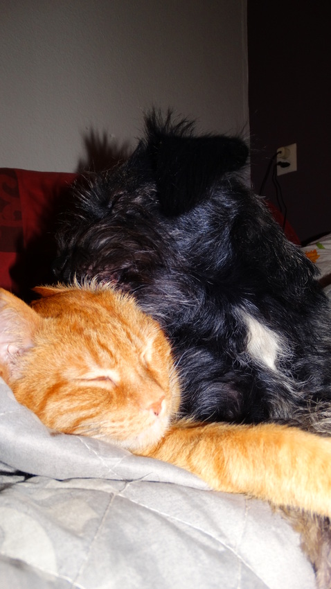 Hier heeft Romy de vreemde gewoonte om altijd boven op Spikey te gaan zitten of liggen