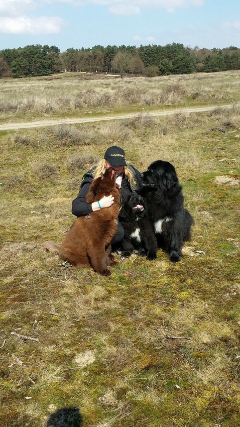 Ik doe het altijd zelf, maar ik kan nog niet op de grond zo zitten, en daar doen ze het opeen tafel, en al had ik die, heel lang stilstaan lukt ook nog niet...even een beetje hulp........de trimster heeft ook newfoundlanders, en Ogin mag mee , mag daar ook mooi rondlopen, super, andérs had ik het niet gedaan, er gaat toch een hoop tijd inzitten en Ogin is dan nog niet zo lang bij me.