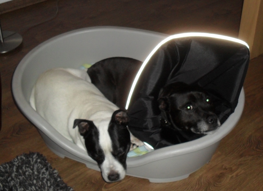 De hondjes moeten eigenlijk gescheiden liggen omdat er niet gelikt mag worden aan Vigo's wond. Ik ben er nu bij en constant zoeken ze elkaar op en kruipen in het kleine mandje(ze hebben een groot bed)