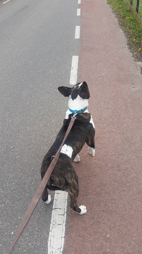 In het begin was het natuurlijk trekken(heb dit zo gelaten ) ,maar zeker op een smalle brug waar het druk is (beiden richtingen lopen mensen )ga je niet even stil staan met een hond die zo snel mogelijk naar het einde wil