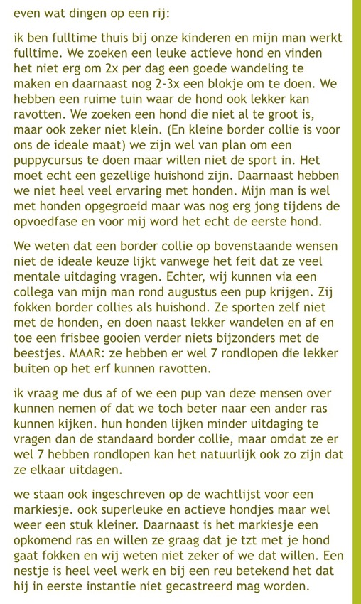 ik ben er wel uit dat het geen border collie word. Nog maar even met mijn man overleggen wat we doen. Van mij hoeft het niet persé een rashond te zijn. Mijn man neigt wel naar een rashond ivm met evt betere gezondheid danwel betere kennis over evt afwijkingen qua gezondheid.
