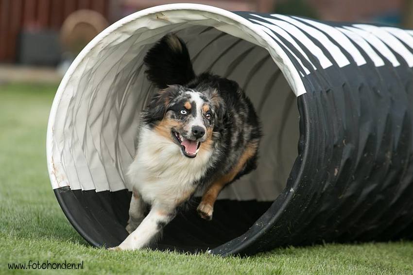 Whisper is een blue merle Mini American Shepherd van 43 cm.