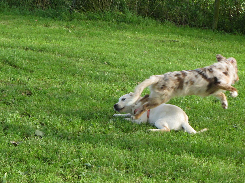 Rennen en bijten met en in Yinti ( de flatcoat van mijn ouders )