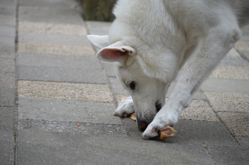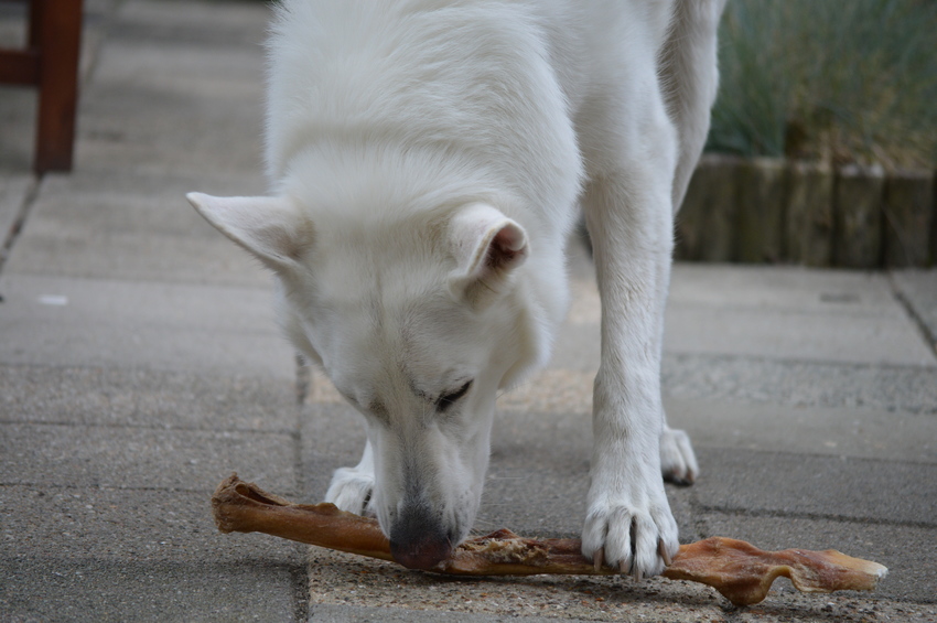 Normaal neem ik nooit geen botten. Heb altijd wel een voorraad kophuiden en vissenhuiden liggen. Maar kophuid doet ze nog geen half uur mee. Maar dat is niet erg. Ze is wel een schone eetster.