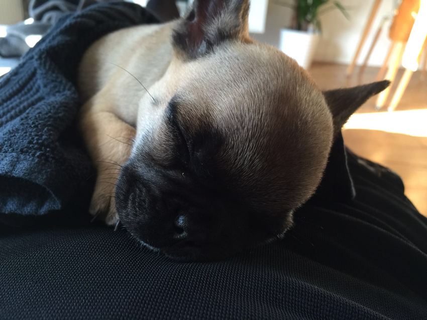Sinds gisteren zijn mijn vriendin en ik eindelijk de trotse eigenaars van Lily, een Frans bulletje van 8,5 week. In de auto ging gisteren alles ontzettend goed. Ze doet het heel goed.