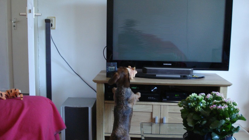 Zo stond mijn pup van de week ook naar de tv te kijken, toen ik mijn fototoestel pakte, ging ze jammer genoeg weer weg.
