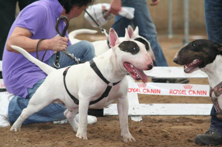 Hèhè. Ik heb even flink op zoek moeten gaan naar de dubbelgangster van ons teefje Wopper. Er is in Nederland maar één bulletje met exact hetzelfde stipje bovenop het hoofd als onze Wopper en dat is Stip.