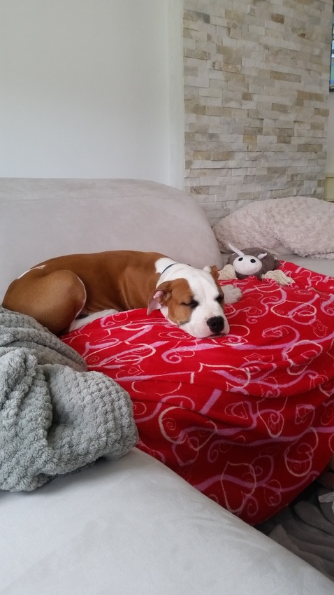 13 weken (zondag 15/05), amerikaanse staffordshire terriër, aangekocht via een kennel. Hier is mijn verhaal!
