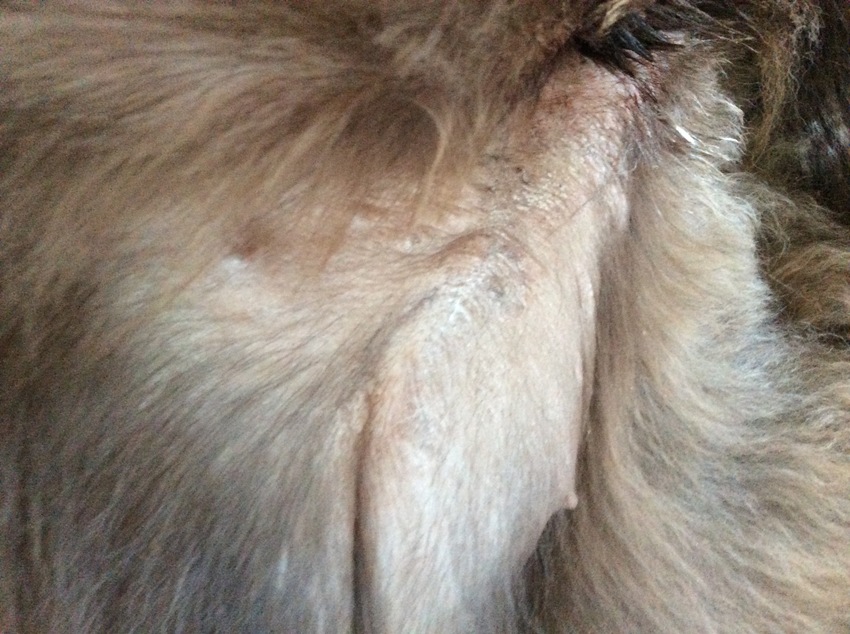 Ik kreeg van haar opvangezin in Spanje door dat ze een droge, jeukende huid heeft door vlooienallergie en dat ze regelmatig moet gewassen worden met vochtinbrengende shampoo.