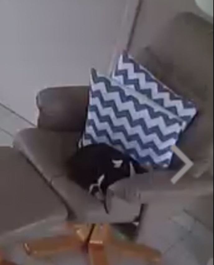 We gaan deze avond snel een hapje eten met de kinderen en wat zien we op de video? Juist..onze boef, in de zetel, tegen mijn nieuwe kussens ![]()