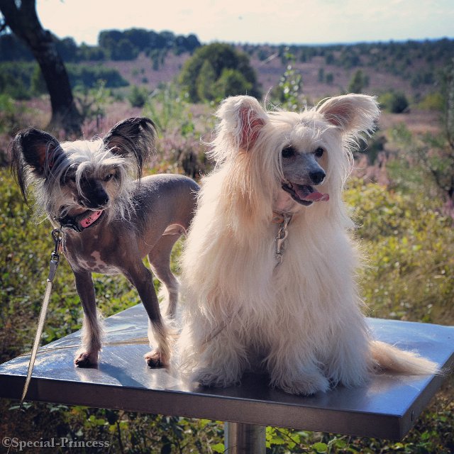 Ons jongste tweetal zijn Chinese Naakthondjes, halfzusjes Elphaba die een powderpuff is (de behaarde variant van dit ras) en 4,5jr oud en de ruim 2,5 jarige hairless Glacee die inmiddels zo'n 4,5 week drachtig is van haar eerste nestje. Chinese Naakthondjes zijn waanzinnig uniek, in hun hele doen en laten. Ze zijn kleine circusartiestjes als het gaat om hun bewegingen en kunstjes doen in het dagelijks leven, en echte clowns qua karakter. Het zijn gezelschapshondjes die niets liever doen dan lekker bij de baas zitten, maar ook echt een jachtinstinct hebben wat met name tijdens wandeling naar boven komt.