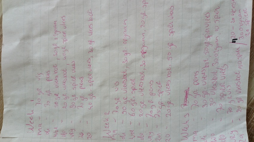 Weet niet of die leesbaar is, maar dit was mijn 3 weken menu en dat herhaalde ik elke keer.