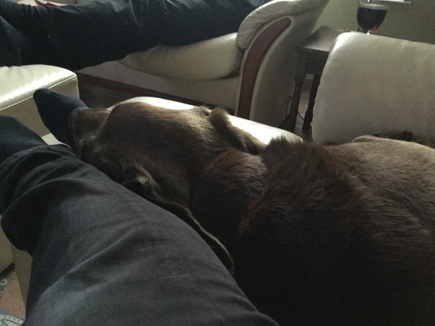 ze is na haar wandeling in bad gesprongen lekker fris en daarna beetje rusten en nu bij het vrouwtje in de zetel slapen.