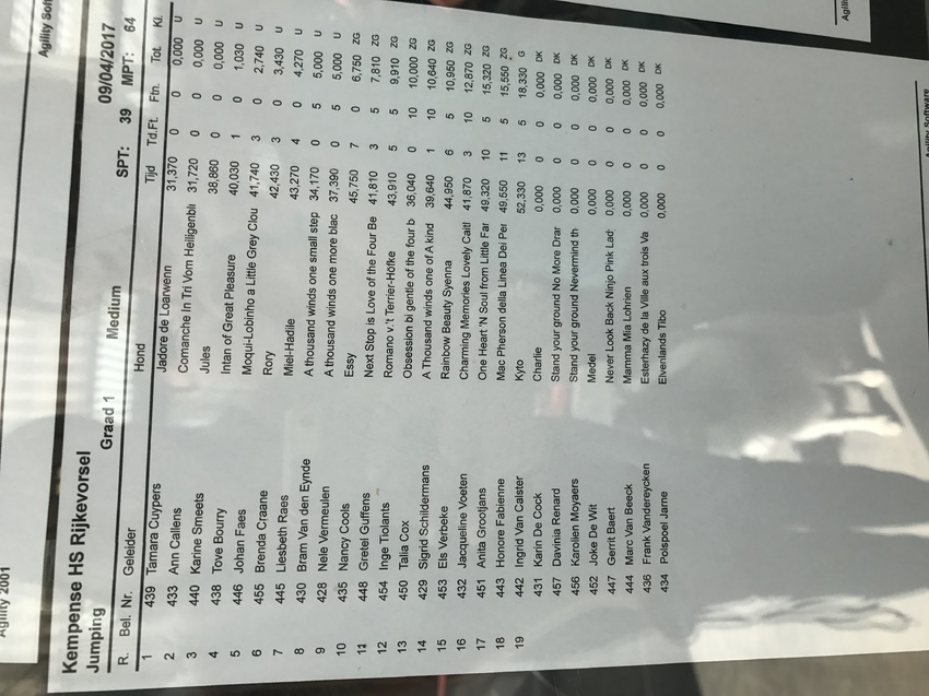 Zo weer een leuke wedstrijddag achter de rug. Vast parcours was echt ontzettend moeilijk. De lijnen klopten helemaal niet. Ene DK na de andere ... udhai is rond gekomen met 2 weigeringen en hij miste het vlak op de kapel. Mooi voor een tweede plaats. De moeilijke stukjes lukten eigenlijk heel goed tot mijn verbazing. Na de kapel had ik hem ook gewoon moeten over gooien (ipv te gaan Belgen voor die sprong) dan had hij waarschijnlijk zijn vlak niet gemist omdat ik breder moest lopen om te Belgen achter die sprong.