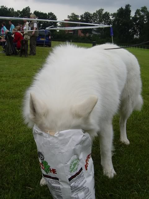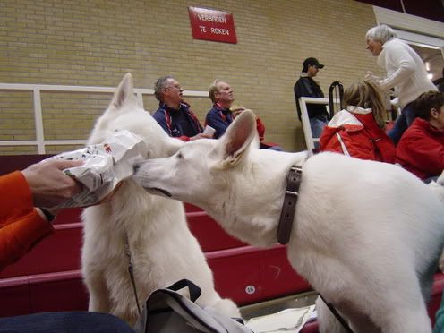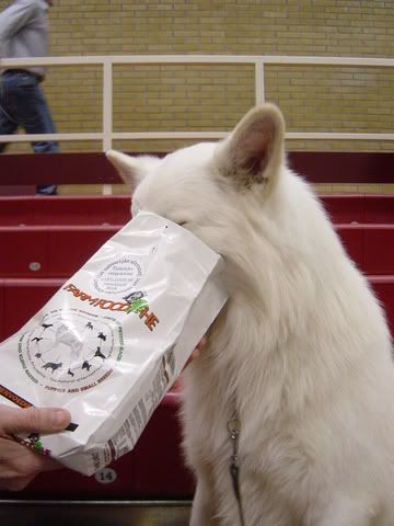 Mexx is een farmfood fan (al mag ie het niet meer eten eigenlijk, elk jaar op de show krijgen we een klein zakje en dat gebruiken we voor de voerbal. Maar een snelle snack voor de zak weggaat moet altijd even: