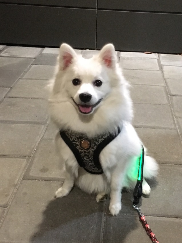 We kunnen nu ook 's avonds een stuk gaan lopen, want de meiden hebben een lichtgevend stuk lijnverlenging gekregen. Die kan Mara gelijk even showen