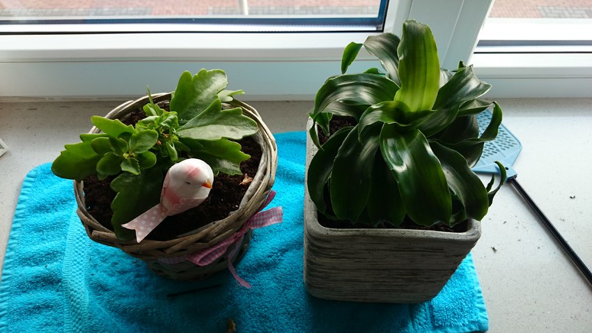 Voor mn verjaardag afgelopen juni het linker bakje gekregen van mn zusje. Er zat een vetplant in, klimop en dat plantje uit het stenen bakje. Nu ging de klimop dood, de vetplant kreeg teveel water en dat andere plantje deed ook niet geweldig goed naar mijn idee.