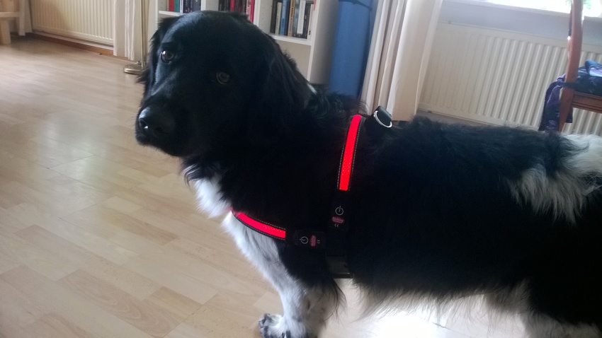 Puck heeft al reflectie op haar tuigje.