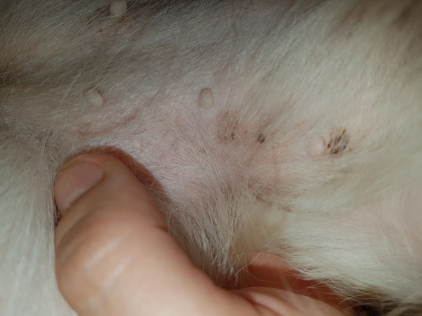Heeft ze in de zon gelegen ?? Dat heb ik met Zebee gehad, zwarte vlekken op haar buik.....naar dierenarts.......was pigment.......'s winters zijn ze weg en 's zomers krijgt ze ze weer.